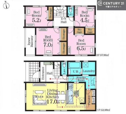 3LDK+ランドリーホール付きの家事動線に優れた住まい。小学校まで約400mと安心の立地。間仕切り対応の2階で将来の変化にも柔軟に対応できます。