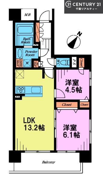 間取り 2LDK (LDK13.2/洋室6.1/洋室4.5)