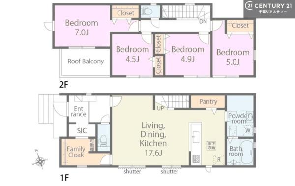 4LDKのゆとりある間取りに、LDK17帖の広々空間。ファミリークロークやパントリー、SICなど収納も充実。駐車場並列2台!