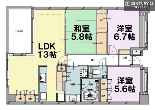 | 間取り | 3LDK (LDK13/和室5.8/洋室6.7/洋室5.6) | ||||