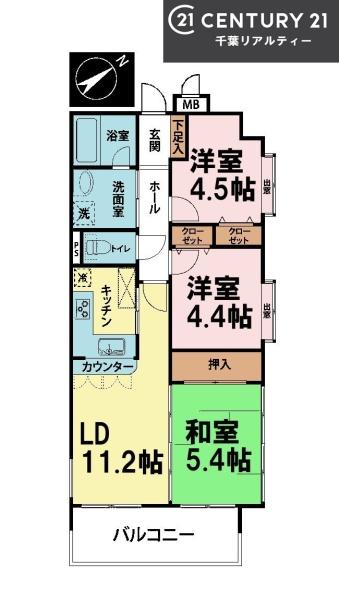 | 間取り | 3LDK (LD11.2/和室5.4/洋室4.5/洋室4.4) | ||||